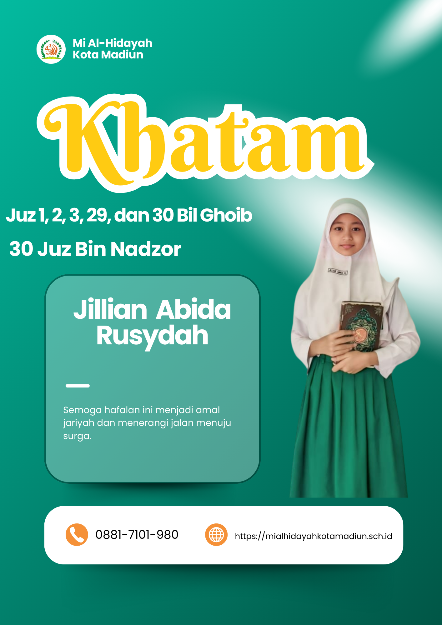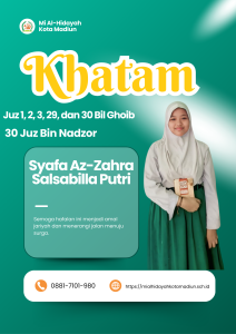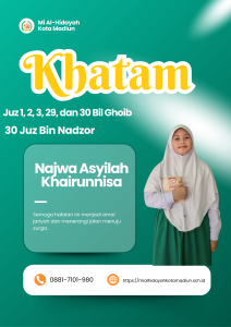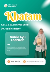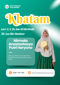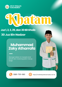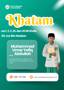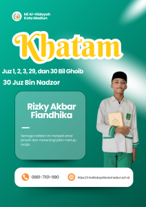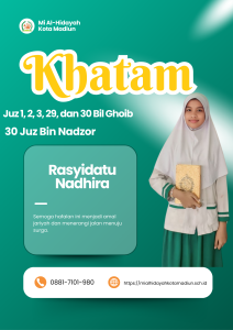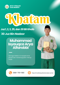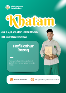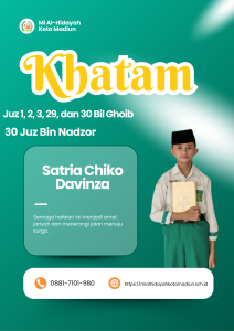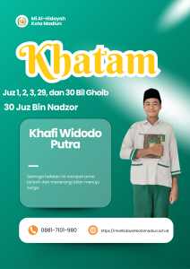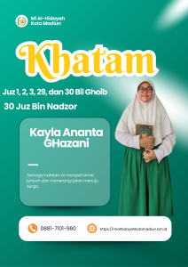 Masya Allah Tabarakallah, Selamat kepada anak-anakĀ kelas 6 Mi Al hidayah Kota Madiun yang telah menyelesaikan hafalan juz 1, 2, 3, 29, dan 30 semoga apa yang diraih dapat bermanfaat bagi diri, orang tua, dan masyarakat.